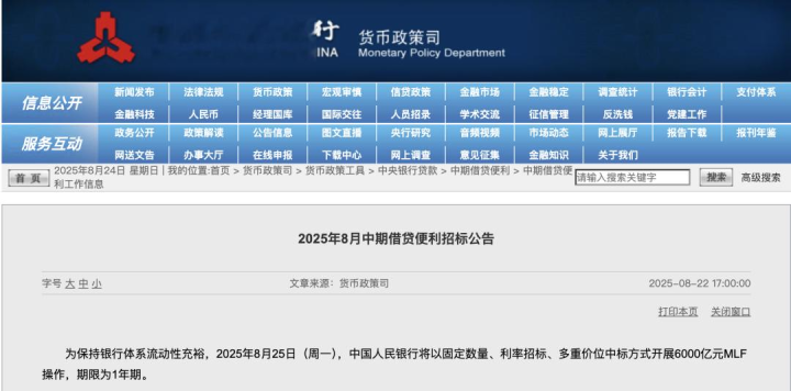 中国人民银行22日发布公告称,为保持银行体系流动性充裕,8月25日中国人民银行将以固定数量、利率招标、多重价位中标方式开展6000亿元中期借贷便利(MLF)操作,期限为1年期。